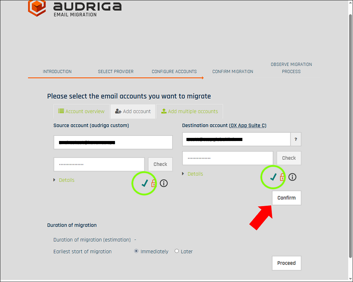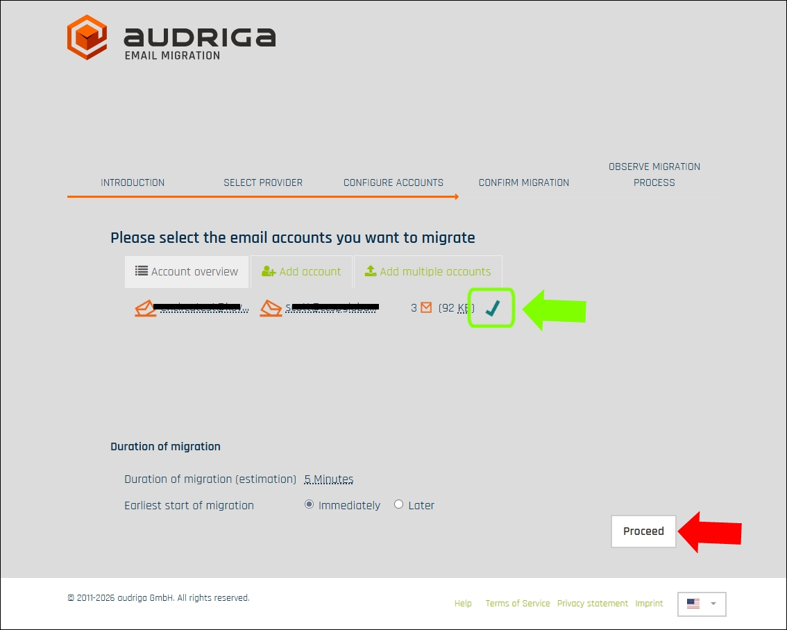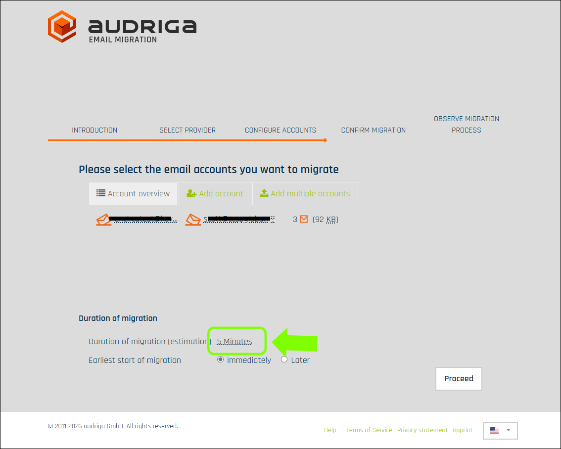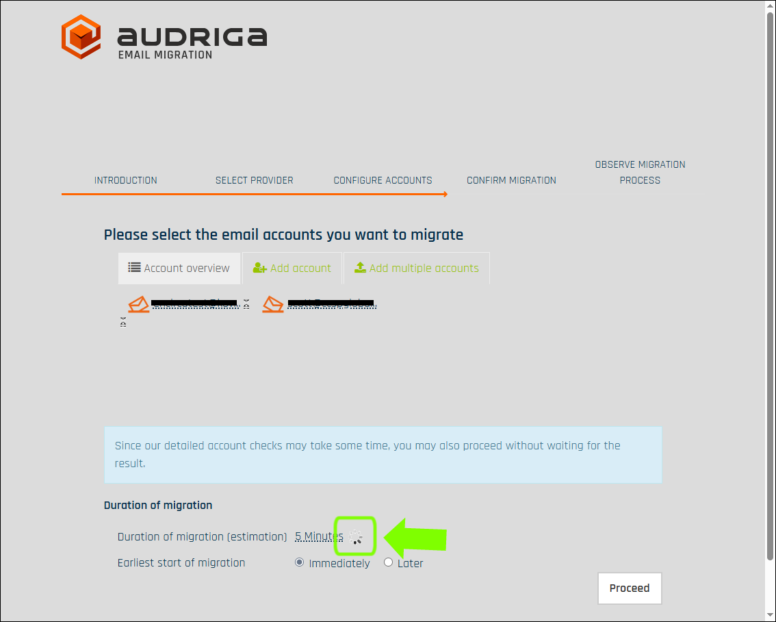 When the migration process is ready to move forward you will see how many emails will be migrated, click [Proceed]