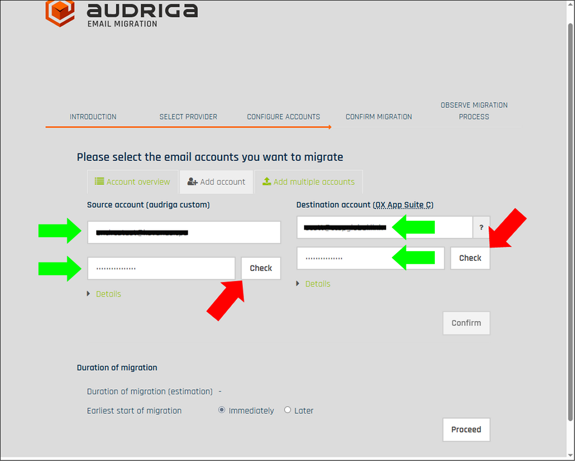 The Source account is the EnCirca email address and password, the destination is the new OX email address and password