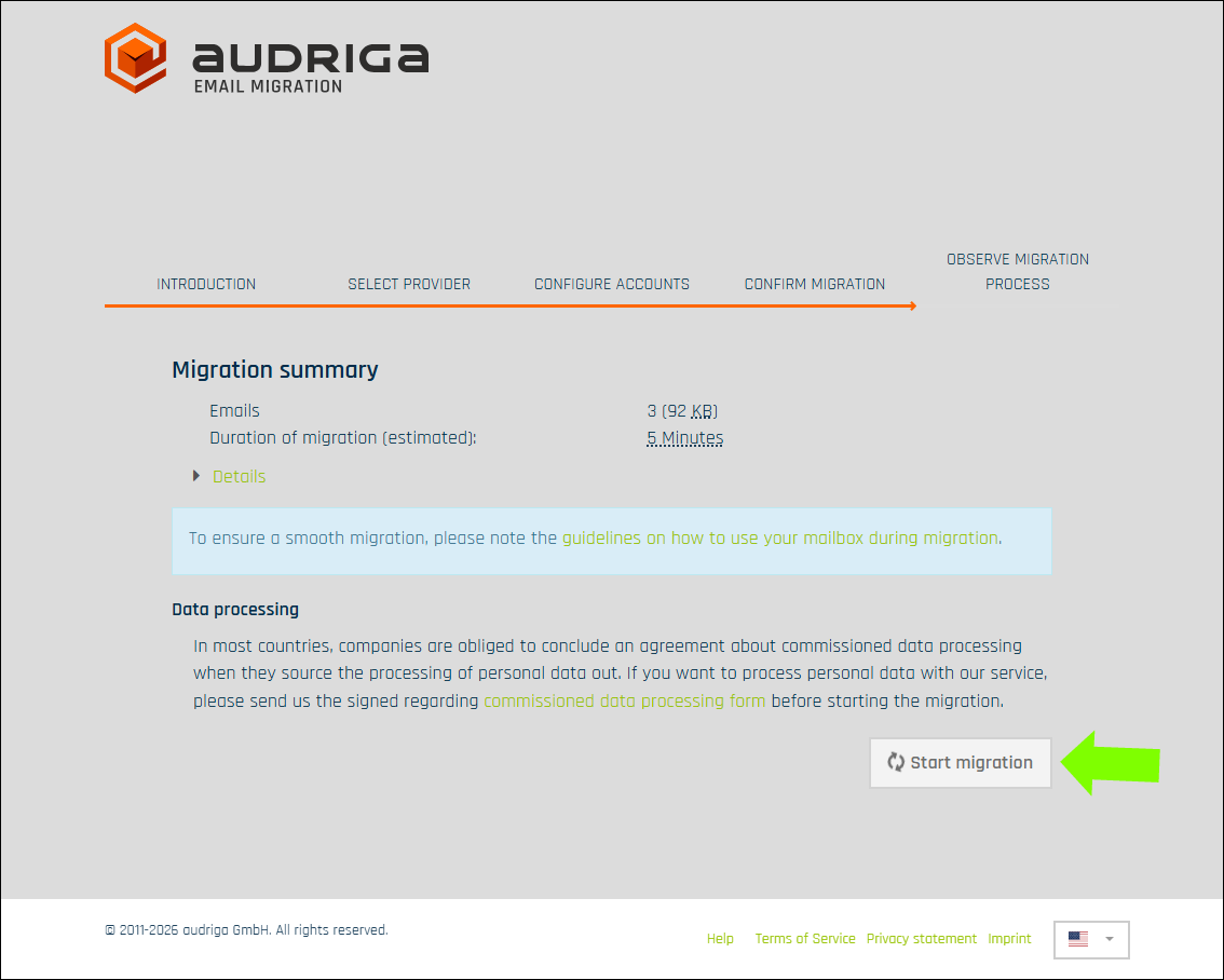 You will notice the [Start migration] button now shows a rotating icon showing it is starting